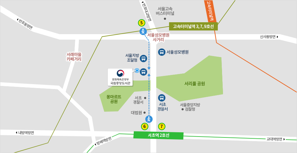 - 서초 13번 / 서초 21번 => '국립중앙도서관'에서 하차