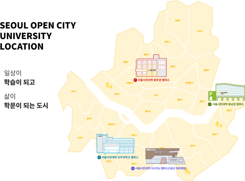 서울 지역은 중부권 캠퍼스, 동남권 캠퍼스, 모두의학교 캠퍼스, 다시 가는 캠퍼스 총 4개가 있습니다.