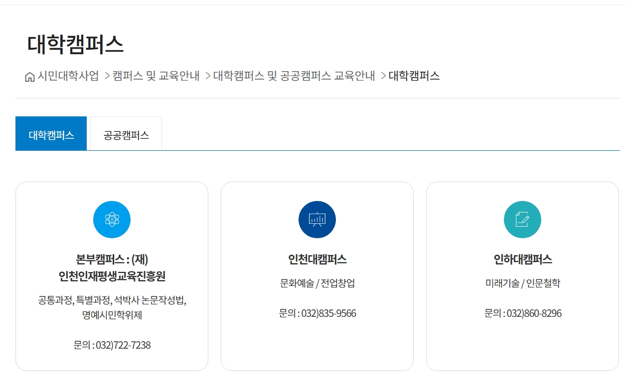인천 지역은 대학 캠퍼스와 공공 캠퍼스 총 2개가 있습니다.